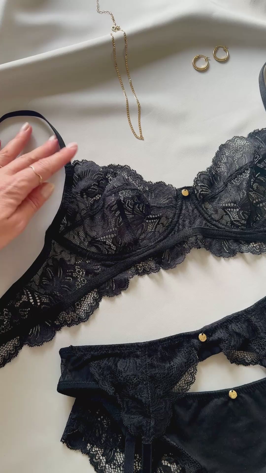Wunderbar dazu: String Caia, Panties Bobby in schwarz und für einen besonders verführerischen Auftritt: unser Strumpfgürtel Caia.