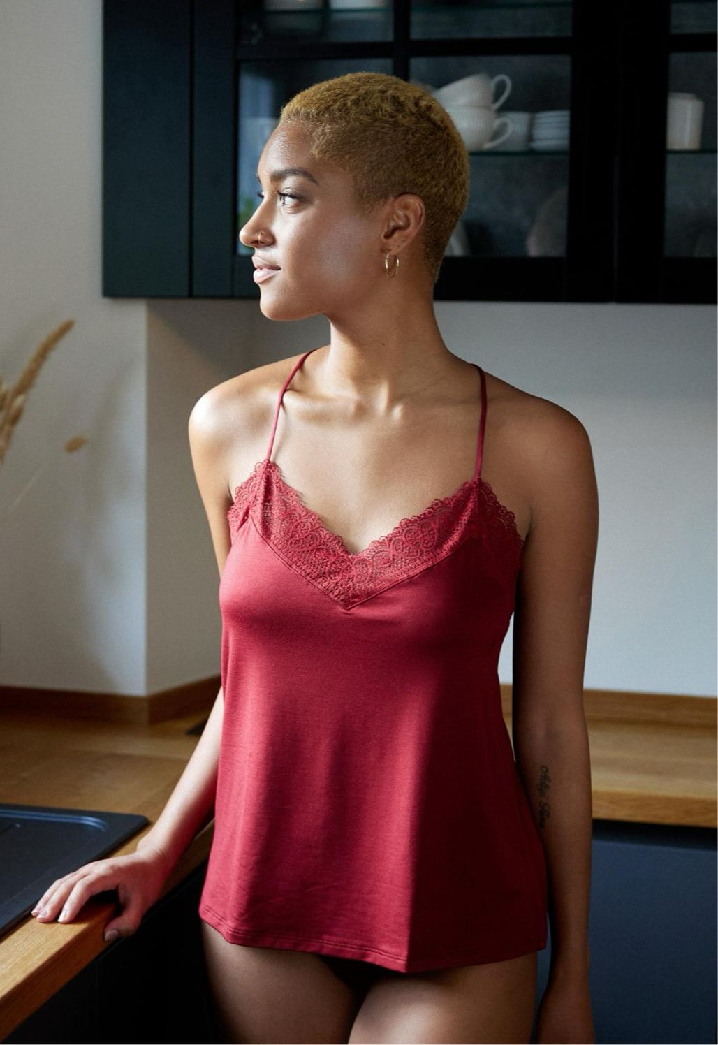 Unser zauberhaftes Camisole gibt es jetzt auch in verführerischem ruby red! Die Spitze am Ausschnitt des Tops passt dabei perfekt zu den Dessous der Leo Kollektion.